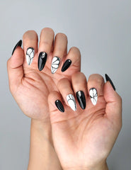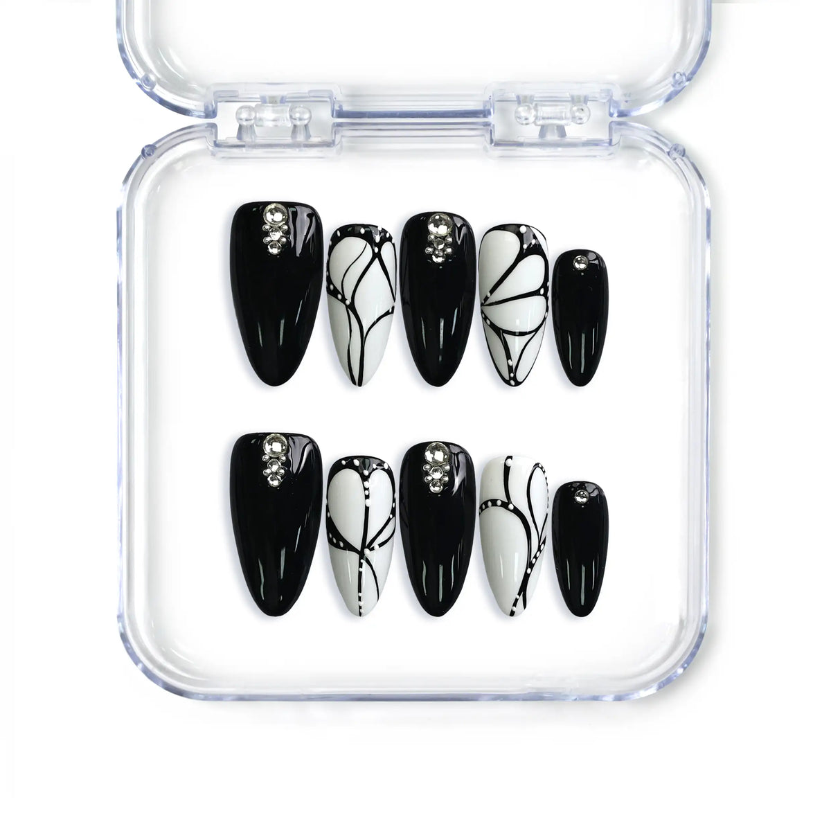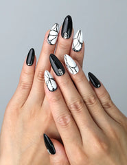 ネイラーバーのシンガポール・プレスオンネイル・コレクションから、エッジの効いたエレガンスと静かなミステリアスが融合した「ミスティック・ノワール」。精巧にハンドメイドされたこのプレスオンネイルは、印象的なブラックとホワイトのカラーパレット、蝶の羽根模様、そして小さなビーズのアクセントが特徴です。縦長のブラックアーモンドネイルは洗練された雰囲気を添え、ディナーパーティーやデートの夜にぴったり。普段使いのスタイルをワンランクアップさせたい時にぴったりです。大胆さと優雅さが融合したブラックプレスオンネイルを愛する方に、ぜひお試しいただきたい逸品です。