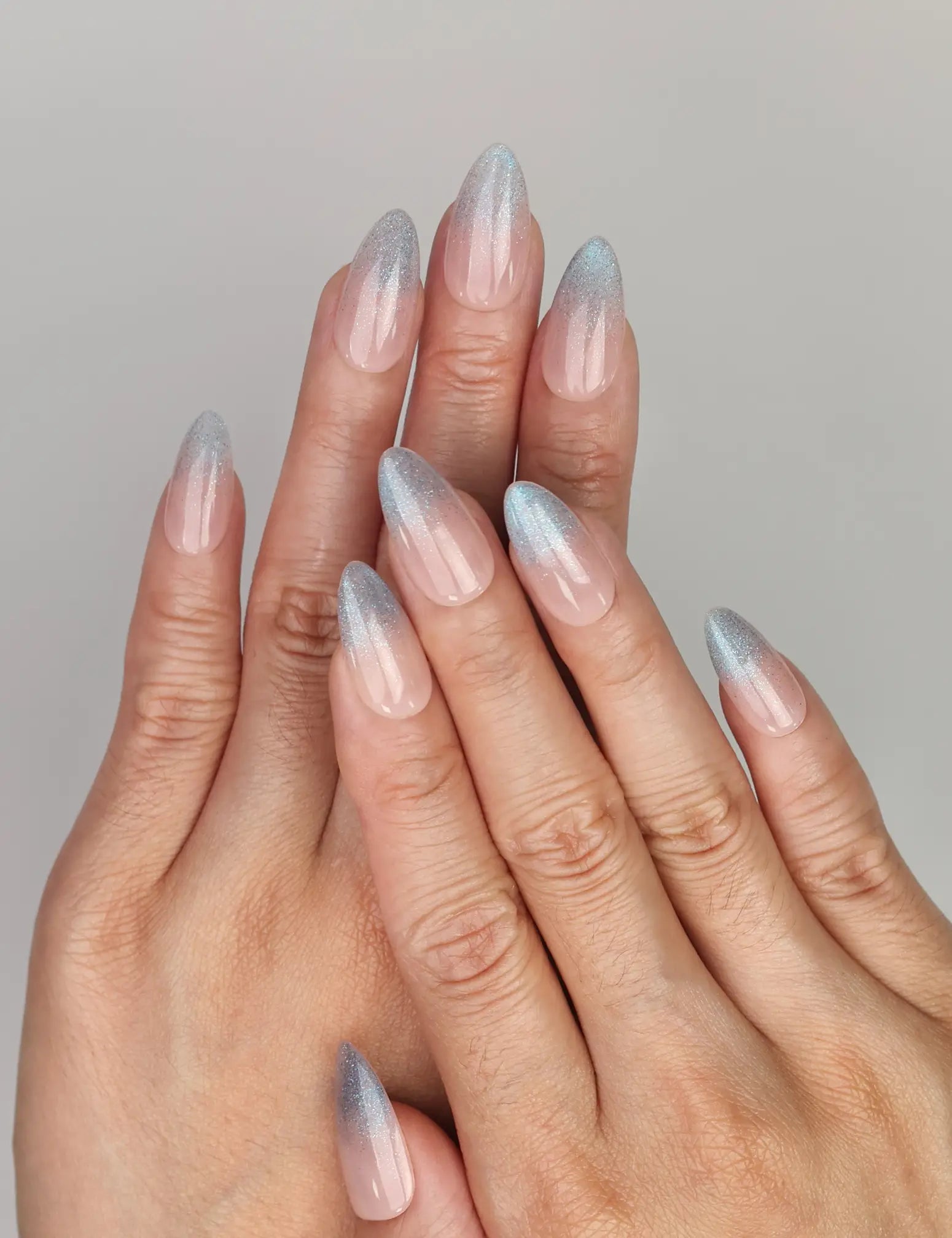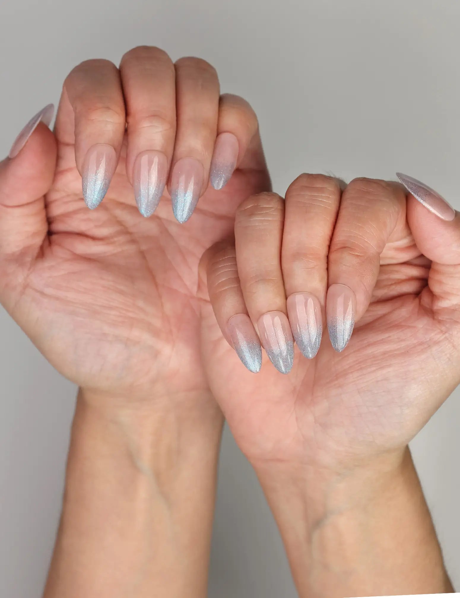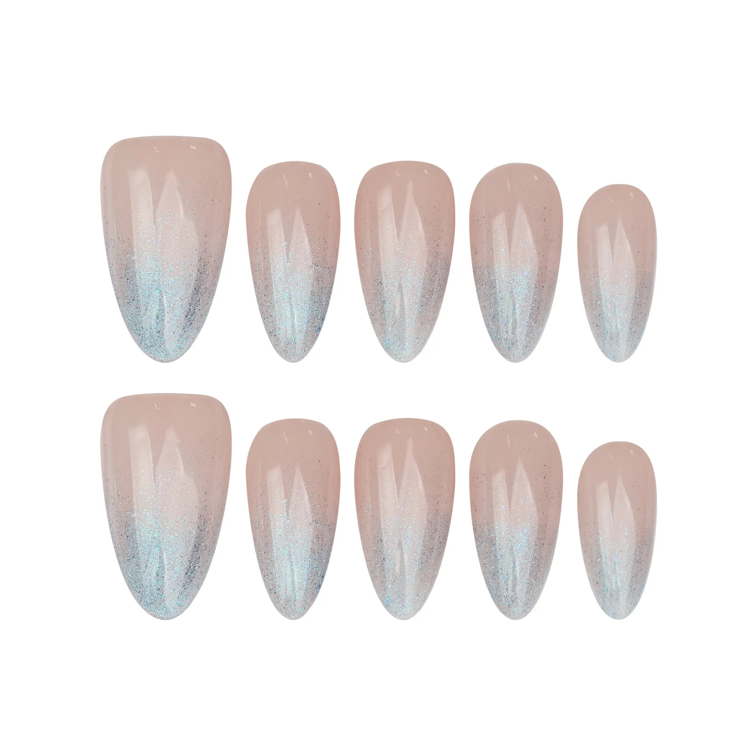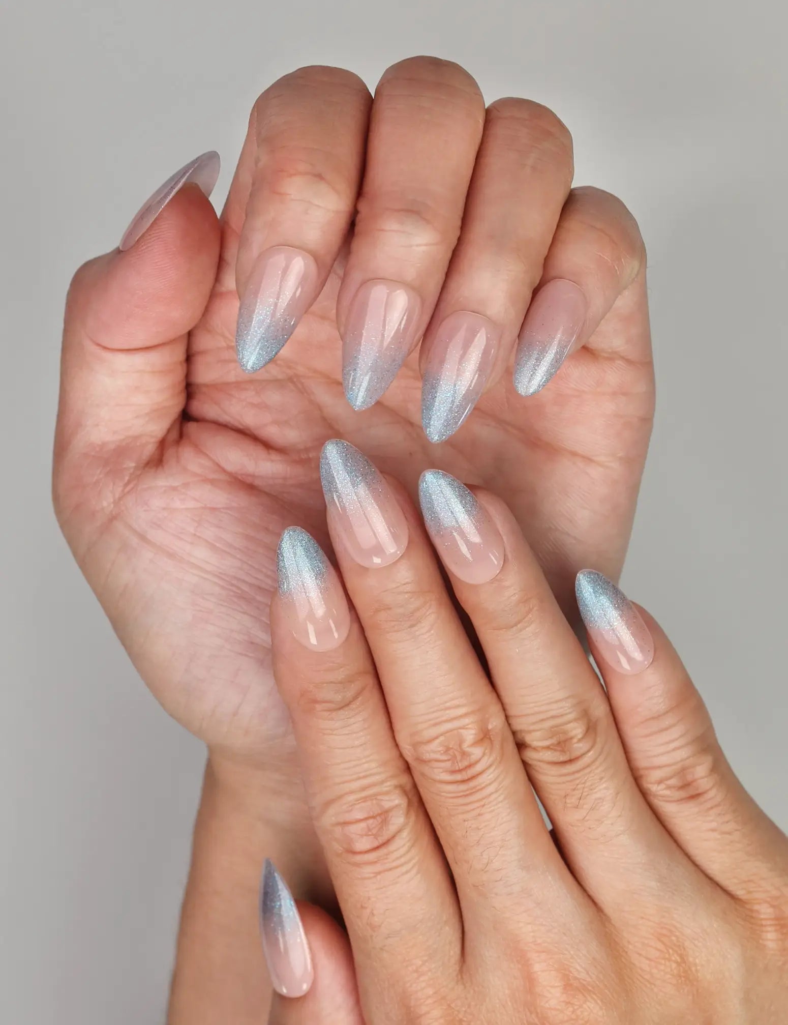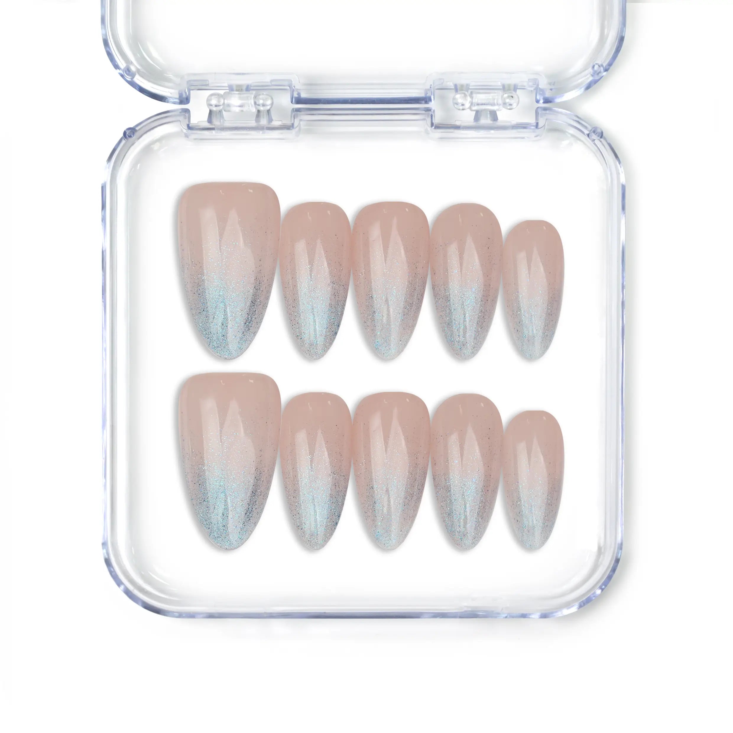Get that viral shimmer instantly with this essential set of handmade press on nails. These elevated simple nails feature a clean, milky-pink base with a dazzling blue-pink iridescent chrome shift. The flawless, mirror-like finish needs no extra decoration. Perfect for a chic, futuristic daily look or a head-turning, ethereal manicure.
