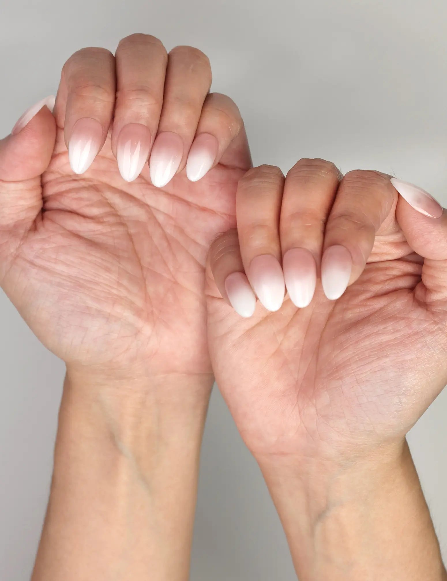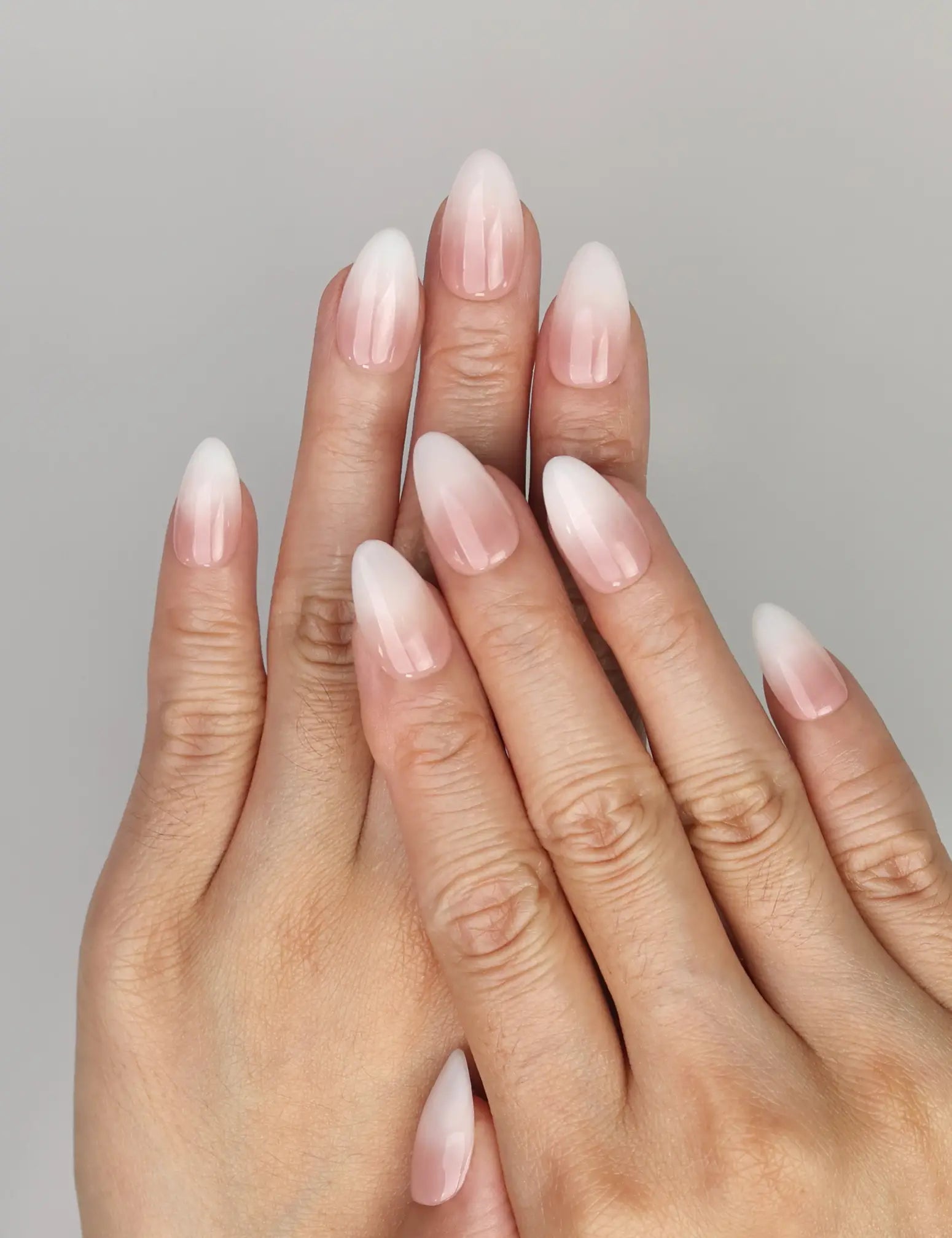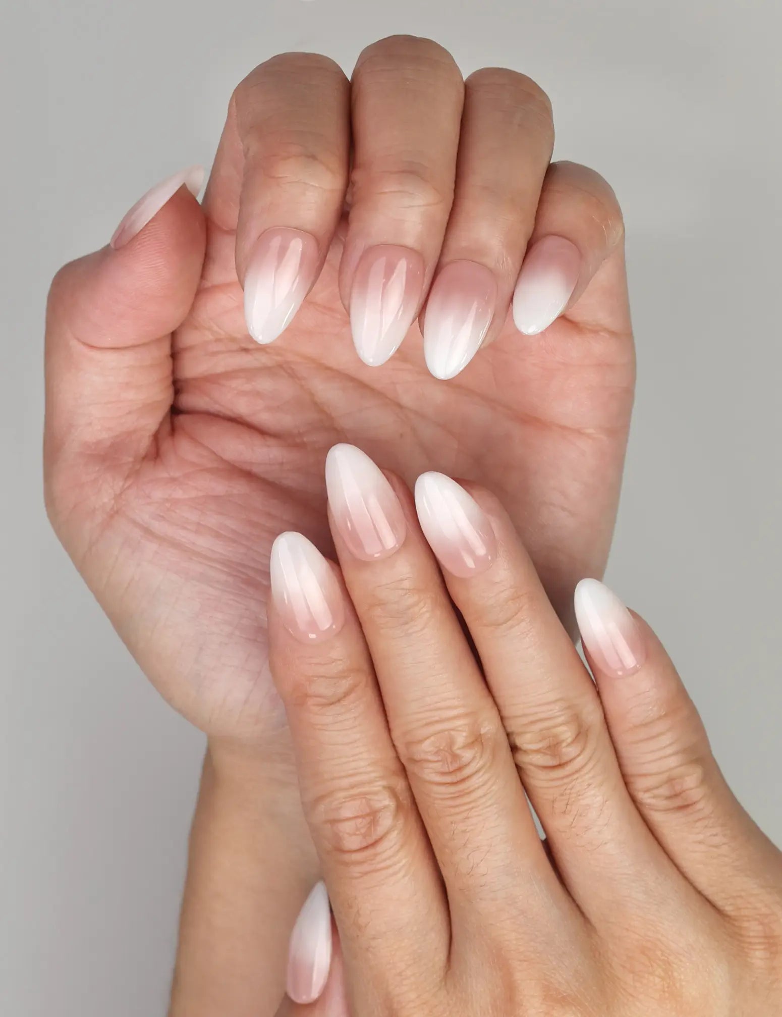 Achieve the perfect, subtle manicure with this beautiful set of handmade press on nails. This clean and timeless design features a soft, pink-to-milky-white ombre finish, offering a refined, natural look. With zero embellishments, the elegance lies in the flawless, high-gloss color transition. These are the perfect versatile simple nails for everyday wear, a polished office look, or classic bridal beauty.