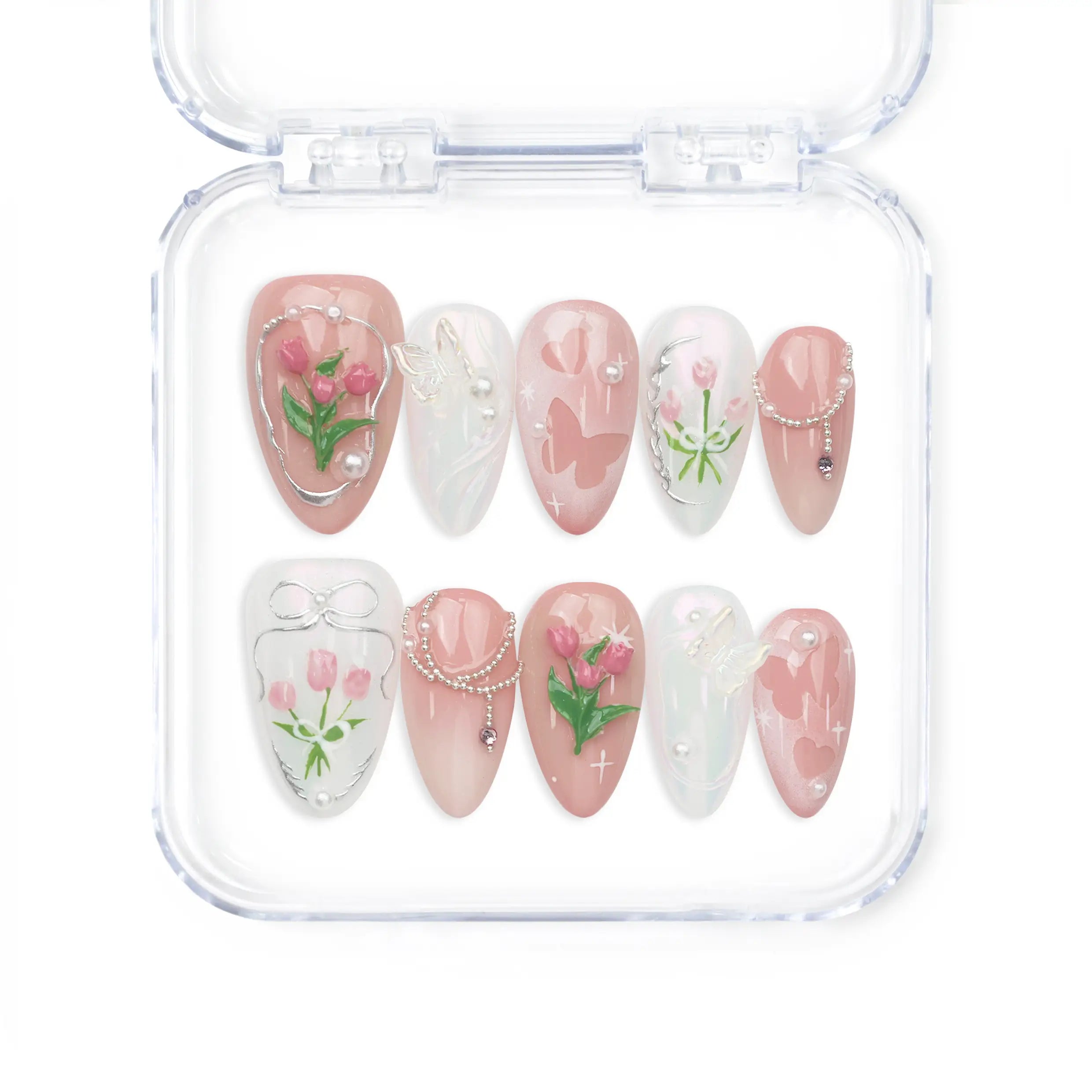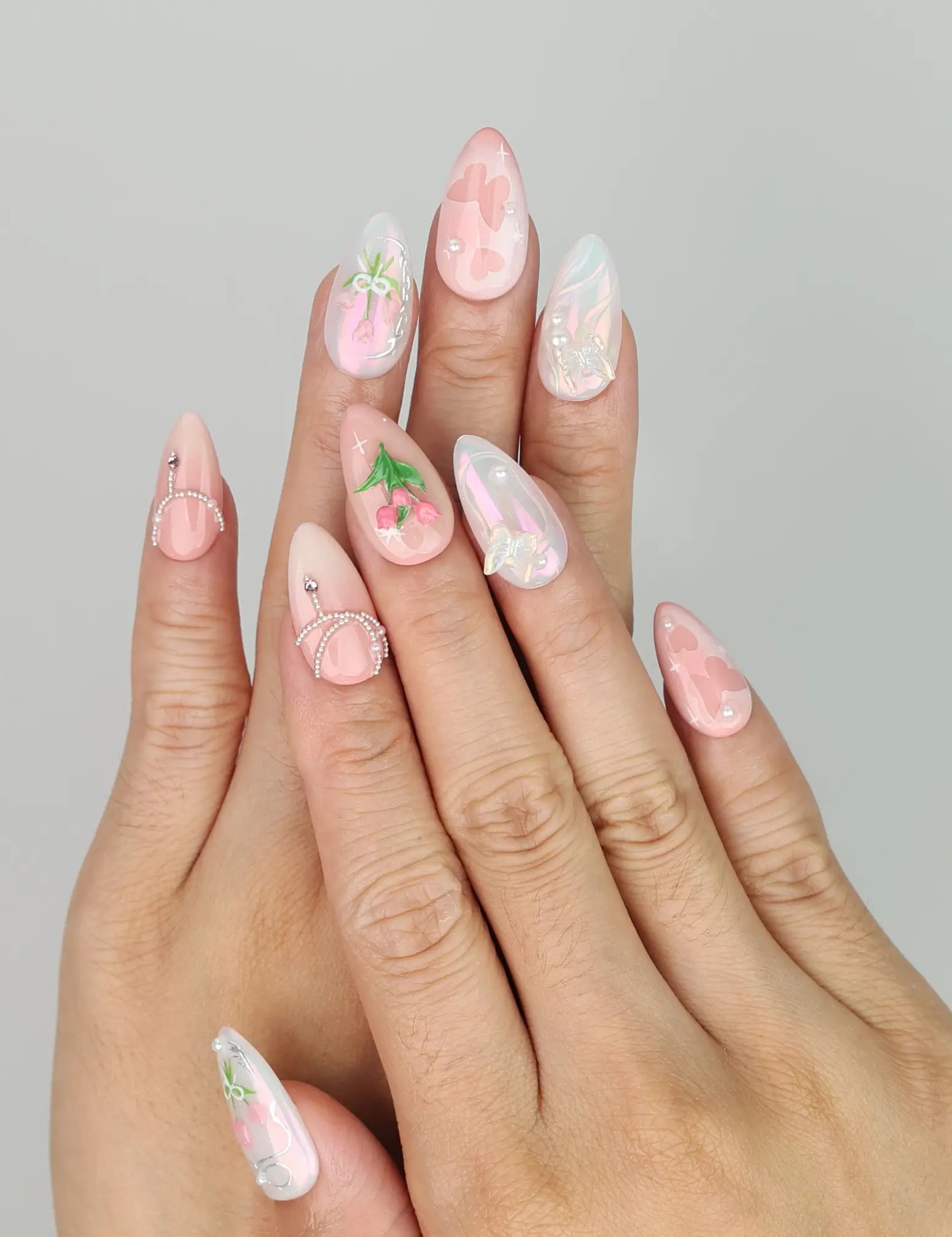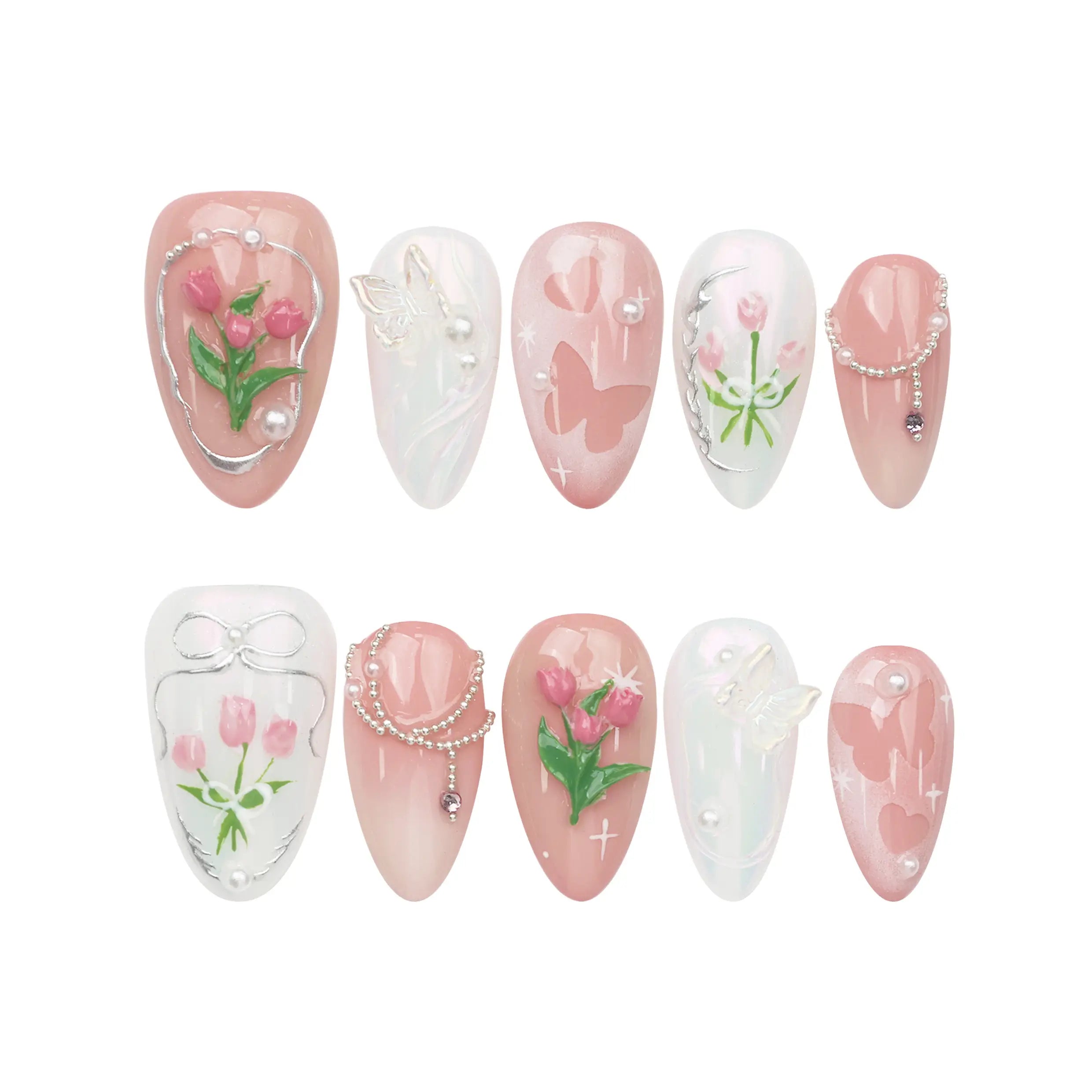 Elevate your style with our trendy nails, a perfect fusion of fashion and artistry. These Singapore press on nails feature a soft pink and white gradient base. Each handmade press on nail is elegantly decorated with delicate floral motifs and intricate butterfly designs. Ideal for a bridal event or a chic social gathering, these nails will complement your look with a touch of sophistication and grace.