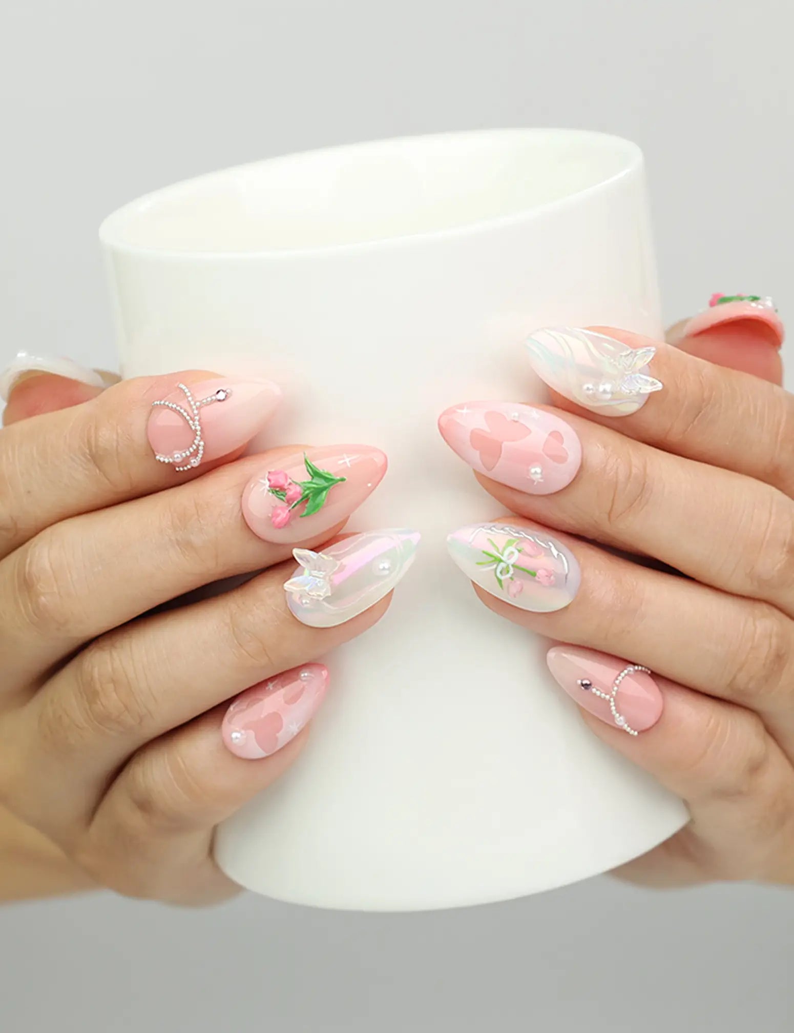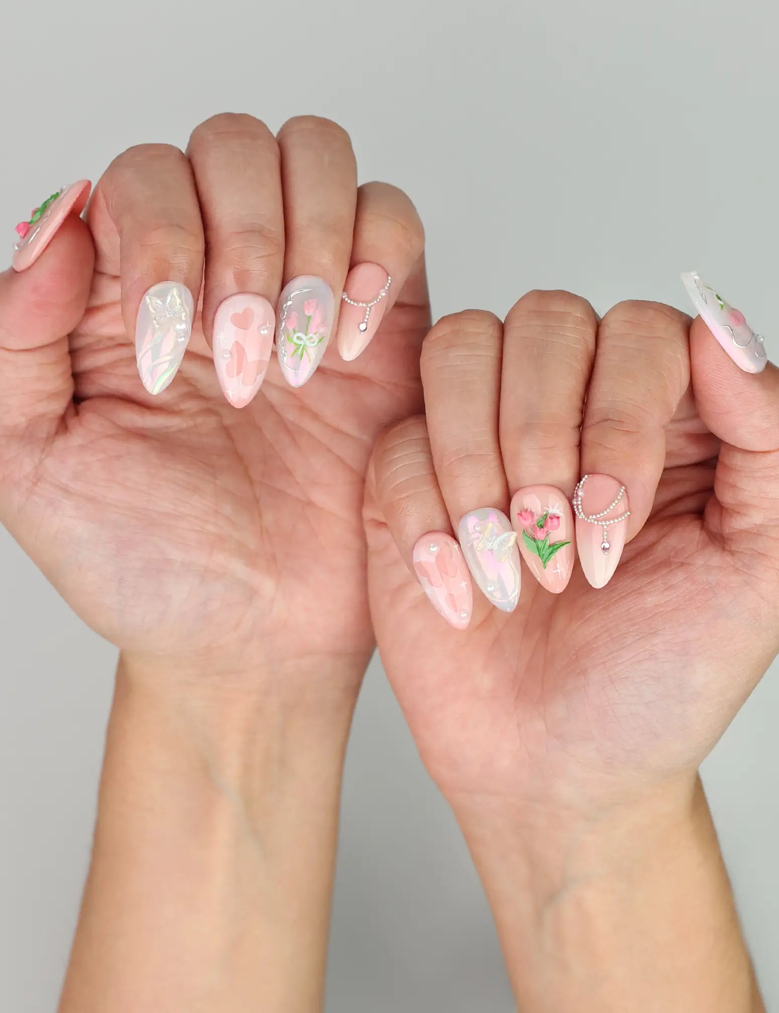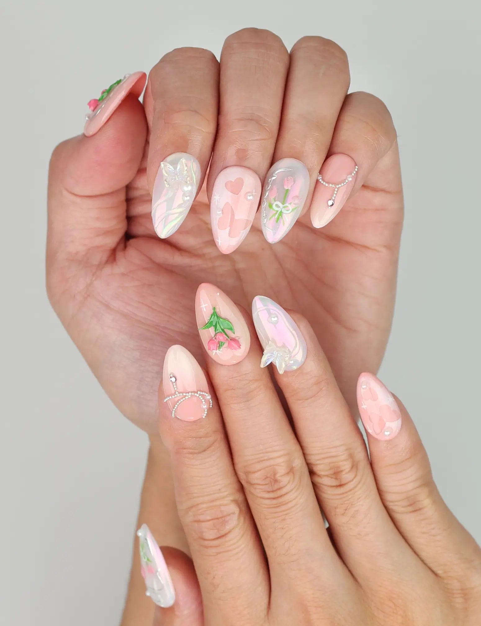 Elevate your style with our trendy nails, a perfect fusion of fashion and artistry. These Singapore press on nails feature a soft pink and white gradient base. Each handmade press on nail is elegantly decorated with delicate floral motifs and intricate butterfly designs. Ideal for a bridal event or a chic social gathering, these nails will complement your look with a touch of sophistication and grace.