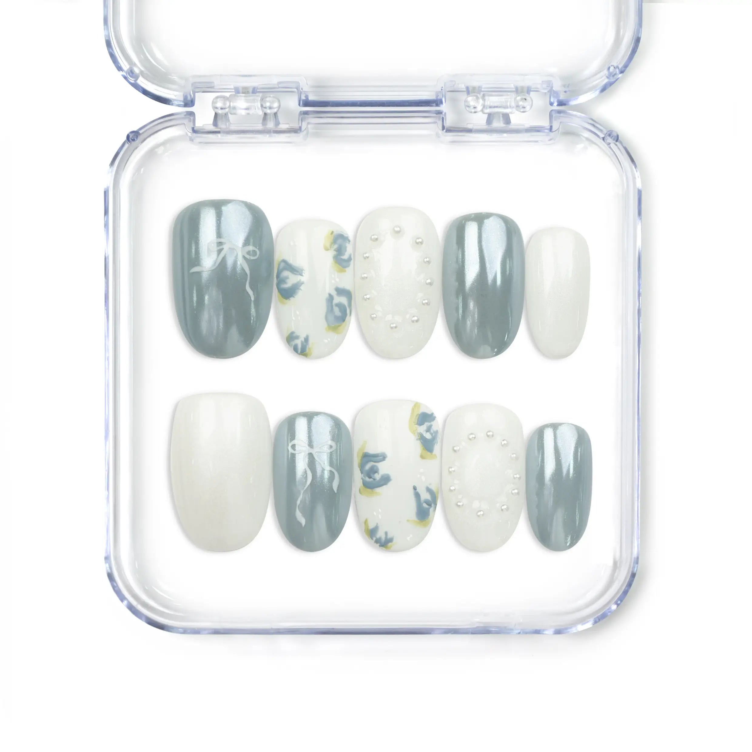 This captivating set of trendy nails is a must-have for soft, feminine style. Each handmade press on nail features a beautiful mix of misty blue-grey and shimmery white in an elegant oval shape. The design includes charming hand-painted bows, delicate blue florals, and an accent nail encircled with tiny pearls. Achieve this beautiful, polished look instantly with our quality Singapore press on nails.