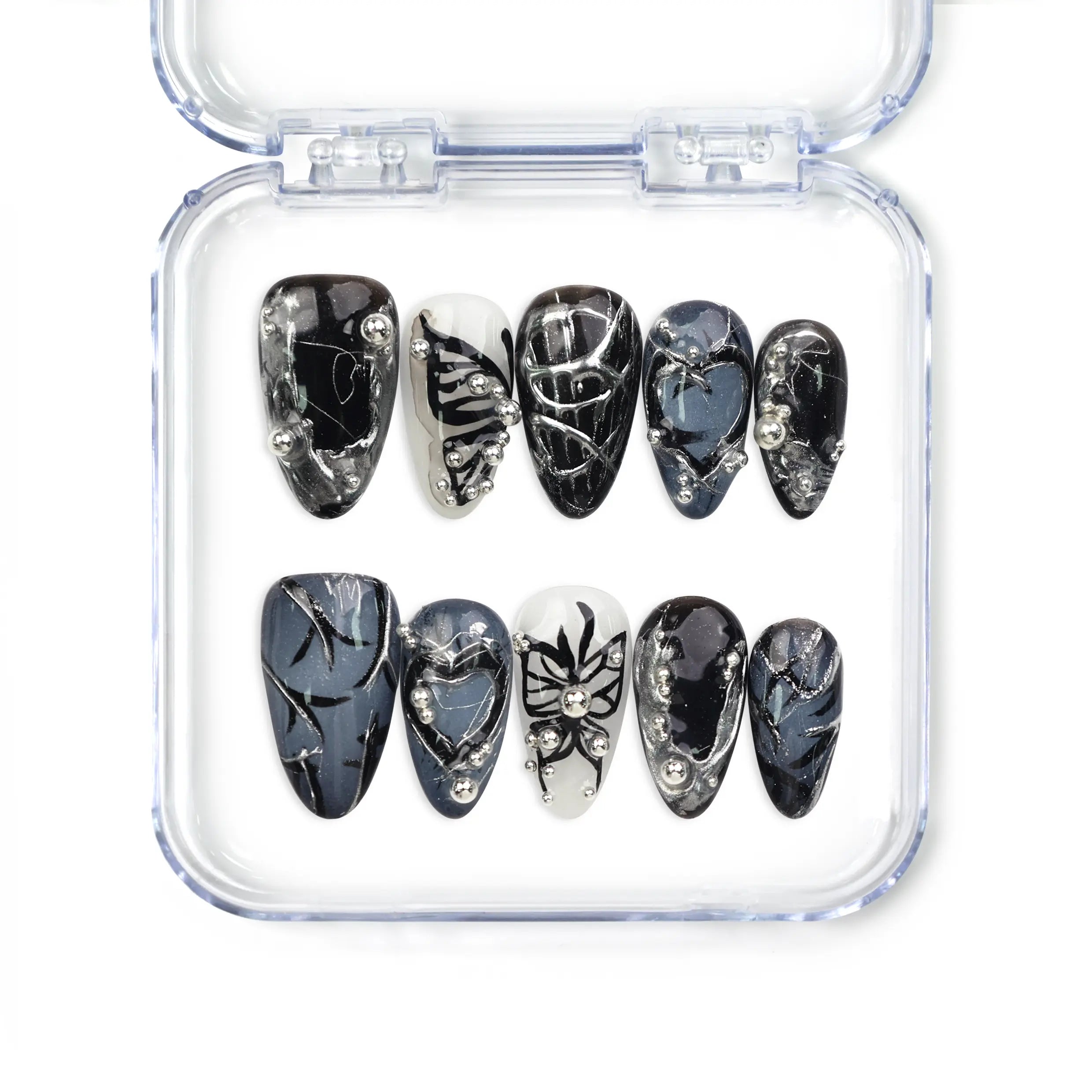 Go full cyberpunk glam! Our edgy Y2K nails are the ultimate statement set. This handmade press on nail collection features a dramatic, short almond shape in a dark palette of glossy black and silver-grey. The design is pure nostalgia with bold, abstract silver "crack" lines, and numerous 3D silver dome studs. Perfect for concerts, festivals, or injecting serious attitude into your look. Get this instant rock-star style with our premium Singapore press on nails.