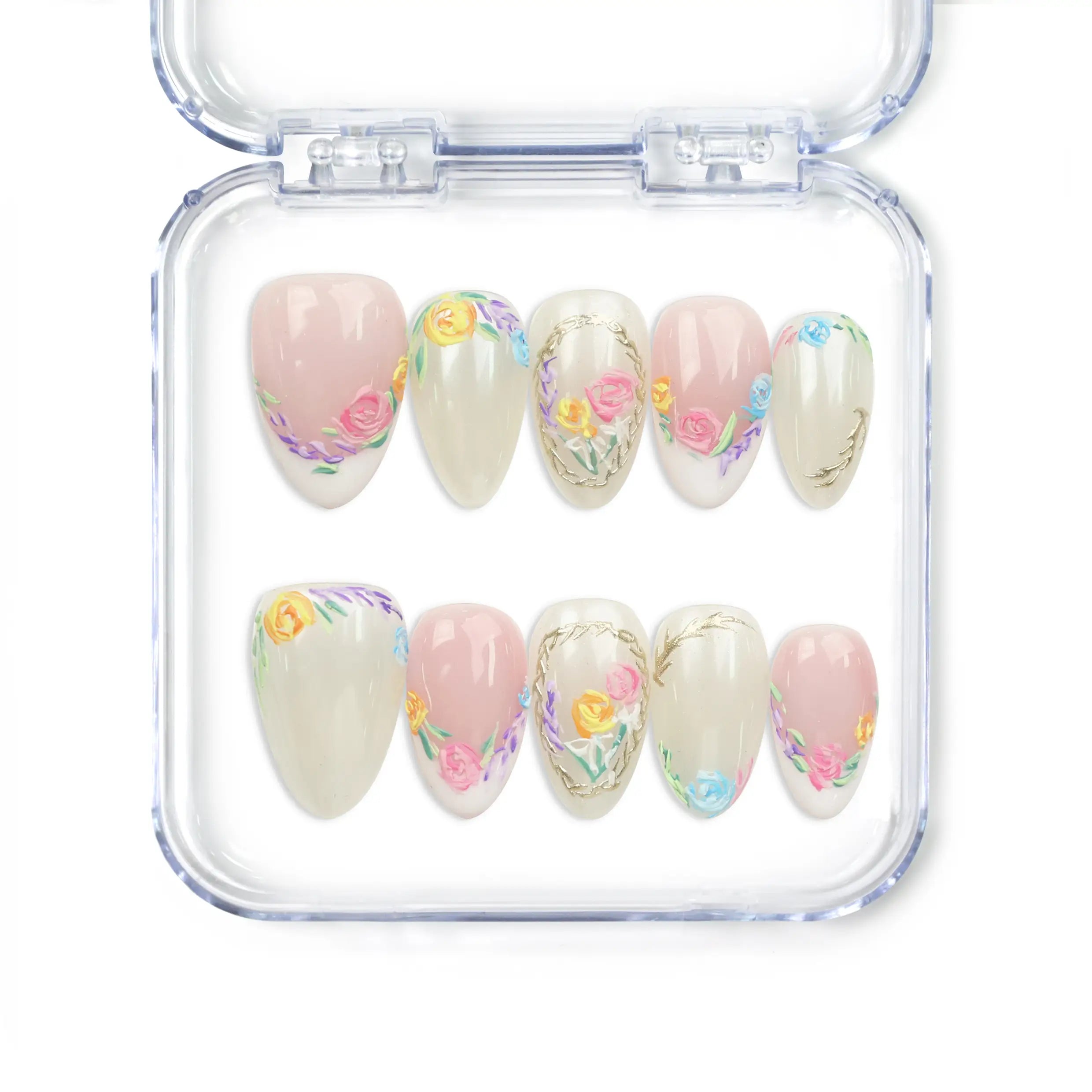 Discover breathtaking artistry with these exquisite Singapore press on nails! This romantic set features a soft pink base, classic white French tips, and a pearl-nude finish. Each handmade press on nail is meticulously detailed with hand-painted roses in soft pastels and elegant gold laurel framing. Perfect for weddings, spring events, or adding timeless, feminine grace to your everyday style.