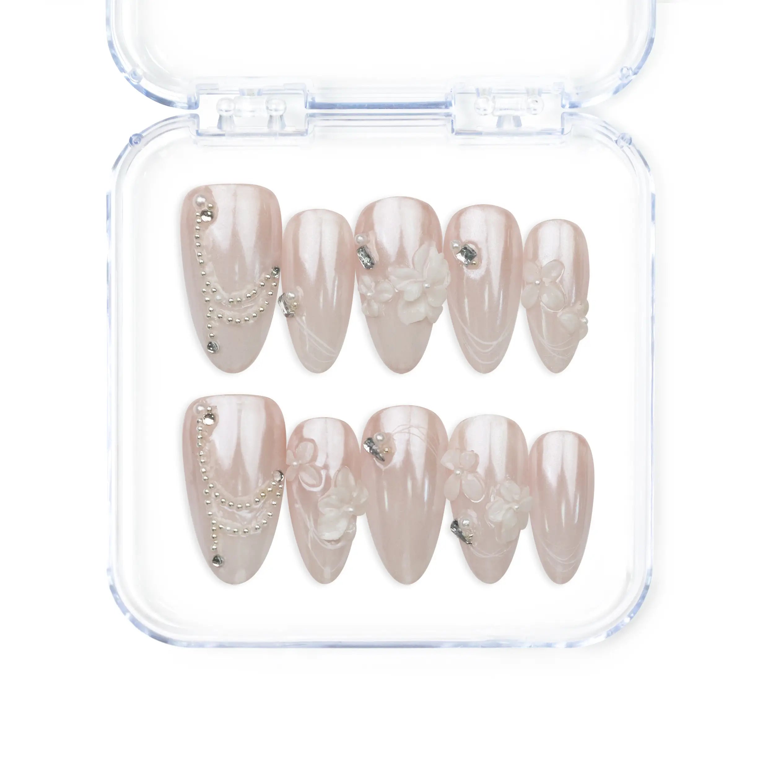 Embrace the latest trend with our trendy nails, a perfect blend of fashion and functionality. These Singapore press on nails, each a handmade press on nail masterpiece, feature a delicate nude base adorned with intricate white floral designs and sparkling rhinestones. Ideal for weddings or upscale events, these nails will enhance your elegance and ensure you stand out with grace.