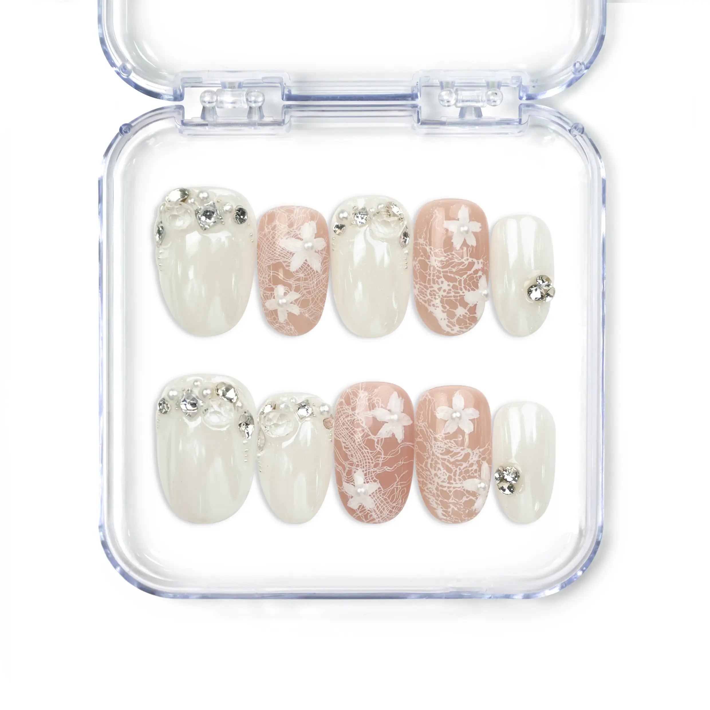 Say "I Do" to these exquisite trendy nails! This utterly romantic set of handmade press on nail is perfect for bridal or special occasion wear. It features a stunning blend of milky white and soft blush pink in an elegant oval shape. The design showcases intricate white lace patterns, delicate floral appliqués, and dazzling rhinestone embellishments for a luxurious finish. Achieve a breathtaking, salon-quality look instantly with our premium Singapore press on nails.