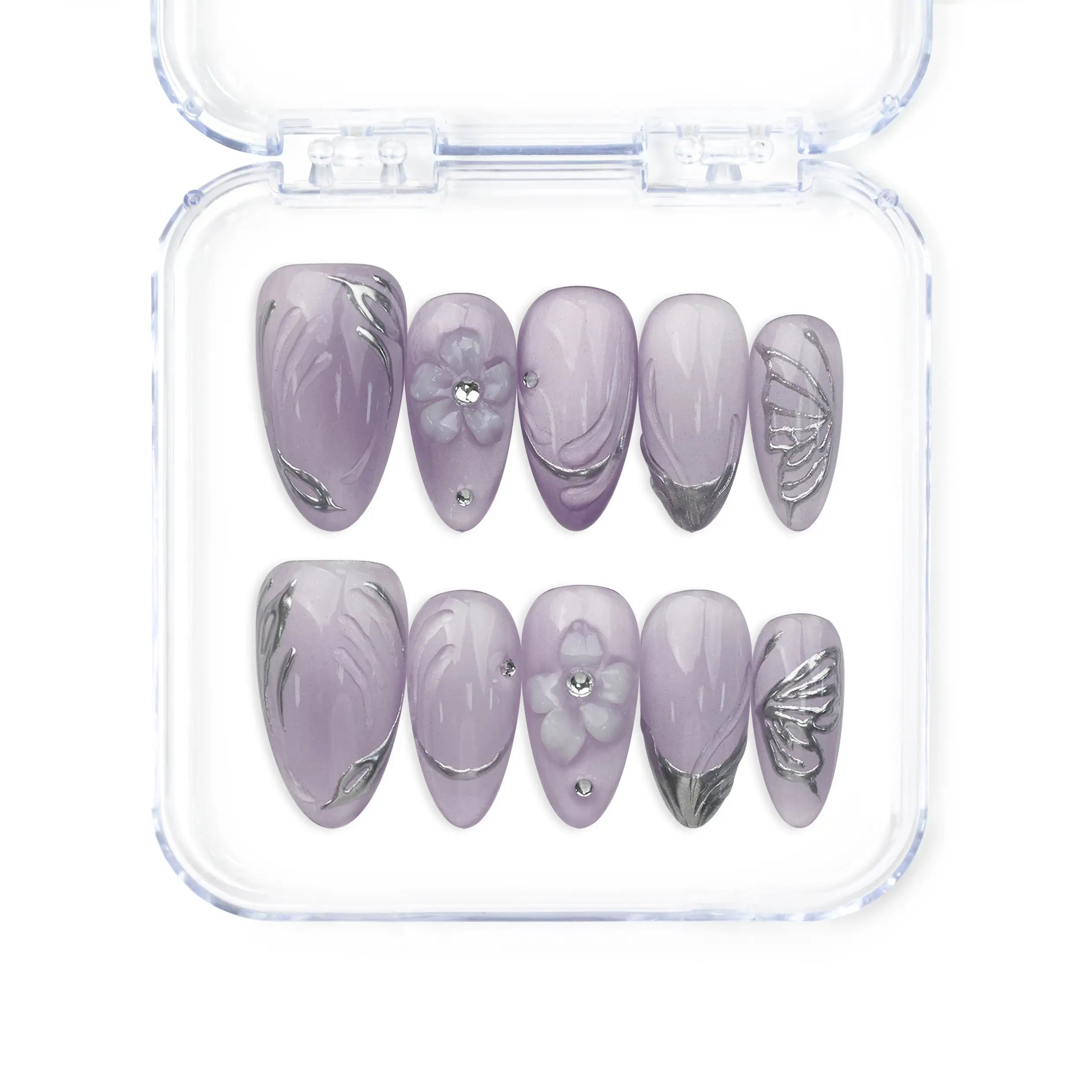 Mesmerize with our cat eye nails, a captivating blend of elegance and allure. These Singapore press on nails feature a stunning lavender base with a mesmerizing cat eye effect. Handmade press on nails are further adorned with delicate floral and leaf patterns, adding a touch of whimsy. Perfect for any sophisticated soiree, promising to accentuate your grace and leave a lasting impression.