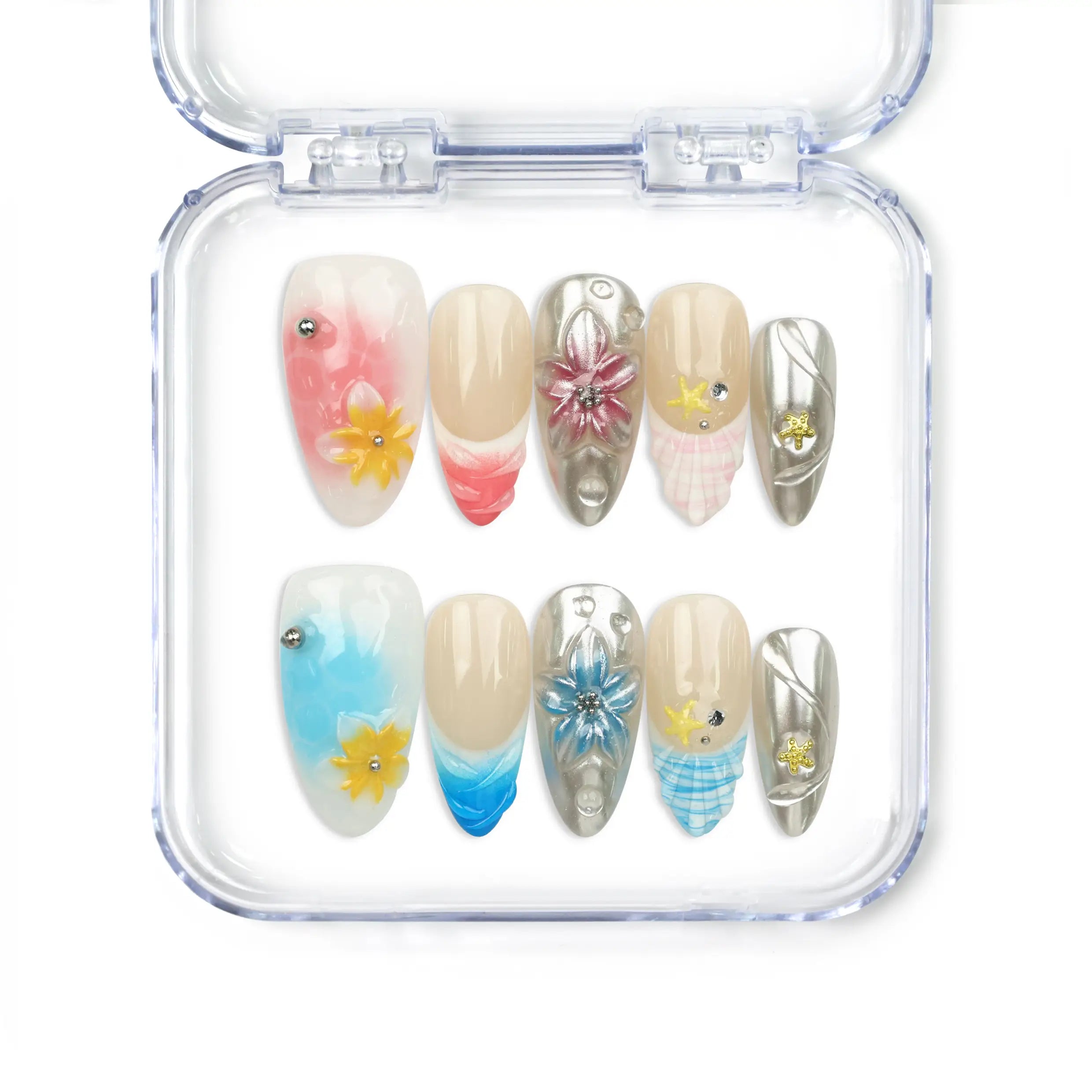 This vibrant set of handmade press on nail captures the perfect vacation vibe with its mix of clear, nude, and shimmering silver oval tips. The design features a playful blend of pink/blue aura effects, 3D summer nails motifs like yellow flowers, textured white shells, and nautical starfish/anchor charms. Instantly achieve a fun, beach-ready manicure. Get your vacation glam easily with our premium Singapore press on nails.