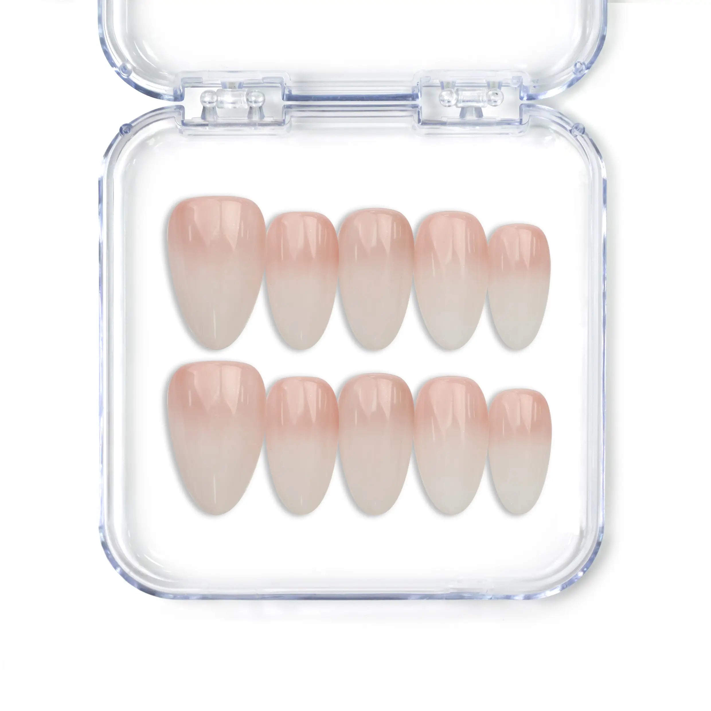 Achieve the perfect, subtle manicure with this beautiful set of handmade press on nails. This clean and timeless design features a soft, pink-to-milky-white ombre finish, offering a refined, natural look. With zero embellishments, the elegance lies in the flawless, high-gloss color transition. These are the perfect versatile simple nails for everyday wear, a polished office look, or classic bridal beauty.